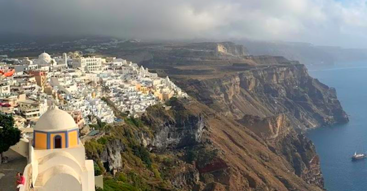 Santorini is famous for blazing sun and blue skies, which is exactly why rain feels so surprising here. When clouds roll in, the island takes on a dramatic mood that makes the whitewashed villages look even brighter.