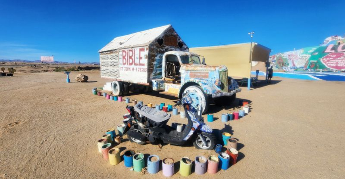 Leonard Knight spent 28 years in the California desert building a mountain out of adobe, straw, and thousands of gallons of paint. Salvation Mountain is a folk art monument covered in flowers, trees, Bible verses, and the words “God is Love” in letters big enough to read from a distance.