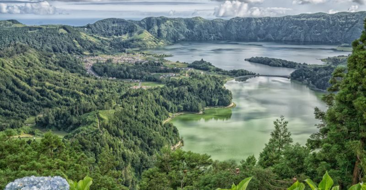 The Sete Cidades caldera features two lakes of different colors — one blue, one green — sitting side by side inside an ancient volcanic crater. Scientists believe the color difference is caused by varying algae and light reflection.