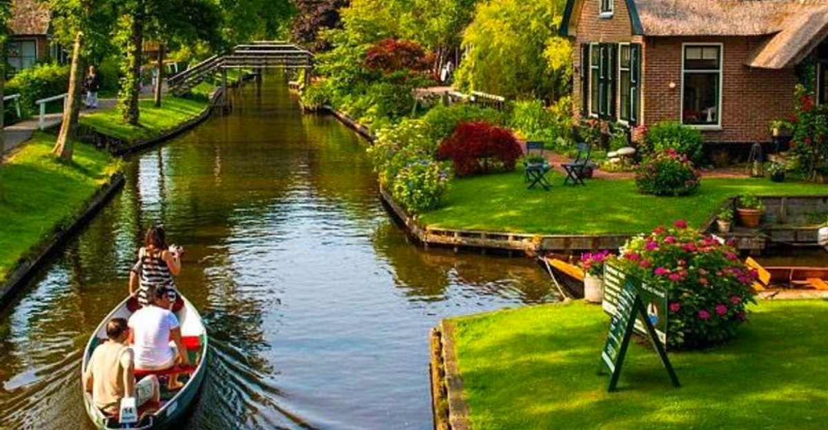 Renting a small electric boat and drifting past thatched-roof farmhouses is genuinely one of those travel experiences that sticks with you. The cottages look like they belong in a children’s picture book, complete with flower gardens spilling over onto wooden bridges.