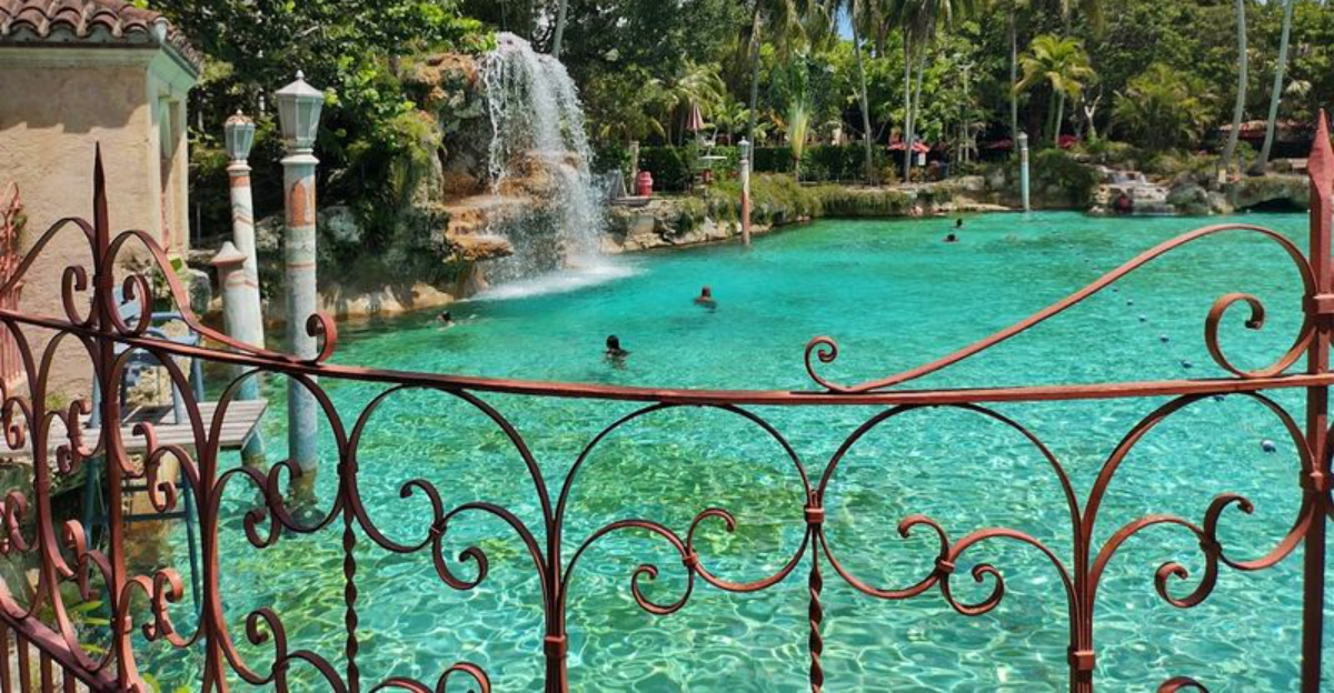 Built in 1923 from a coral rock quarry, the Venetian Pool in Coral Gables is one of the most unusual and visually striking public swimming pools in the world. It looks less like a municipal pool and more like a scene from an ancient Mediterranean village, complete with stone loggias, vine-covered archways, and a waterfall that cascades into the turquoise water below.
