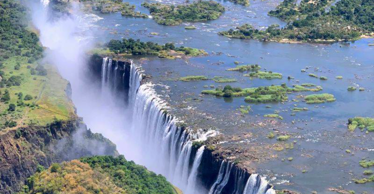 Known locally as Mosi-oa-Tunya—”The Smoke That Thunders”—Victoria Falls creates one of Earth’s most powerful natural spectacles. The Zambezi River plunges over a cliff stretching nearly a mile wide, sending over 500 million liters of water per minute crashing into the gorge below during peak flow.