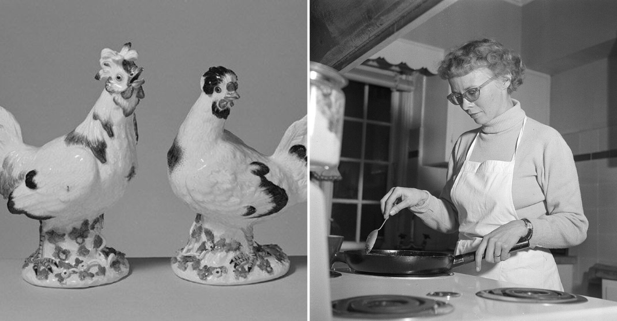 Somehow a rooster always stood guard, tail feathers fanned like a parade float. Maybe it was one, maybe five, perched on shelves and windowsills.