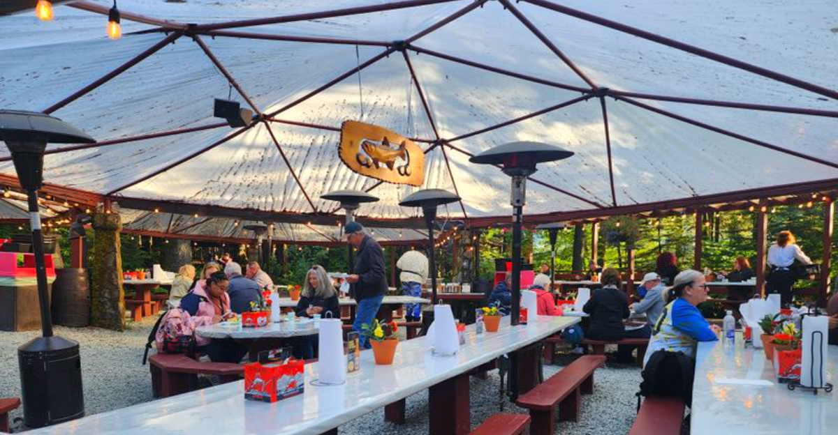 Even on rainy days, covered seating keeps the vibe comfortable. You will likely forget you are minutes from downtown Juneau.