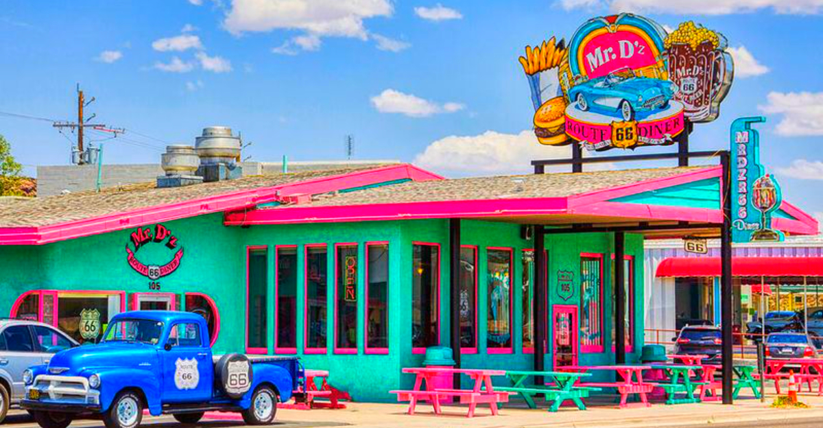 Imagine stepping back into the 1950s at Mr. D’z Route 66 Diner in Kingman, where a vibrant pink and turquoise palette sets the scene. Once a classic gas station-café, this diner now reigns supreme with homemade root beer and hearty burgers.