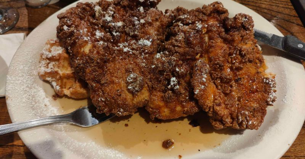 The signature plate arrives gleaming with a golden crust, and you hear the crispy whisper the second your fork breaks through. Waffles come airy with deep pockets, ready to hold melted butter and syrup that smells like caramel sunshine. Bite by bite, the crust shatters, the chicken stays juicy, and the waffle gives soft support.