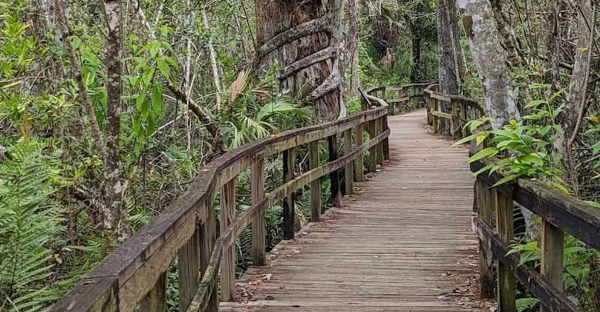 Not every visitor wants to navigate six miles of rutted dirt road before reaching a trailhead. The Big Cypress Bend Boardwalk offers a completely different entry point into the preserve, located along U.S. 41, the Tamiami Trail, a few miles east of Collier.