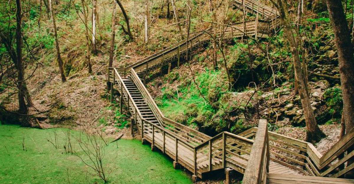 The main event at this park is the wooden staircase that winds 120 feet down into the sinkhole, and it is not something you forget quickly. The structure consists of 132 steps broken up by small wooden landings where you can catch your breath, take photos, or simply stop and listen to the sounds of dripping water and rustling leaves far below.