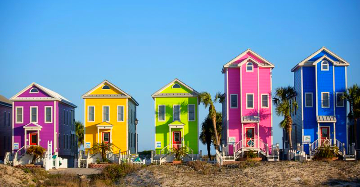 You pass pastel cottages lifted on pilings, mailboxes shaped like fish, and pockets where the dunes peek through. The air smells of sunscreen and cut grass.