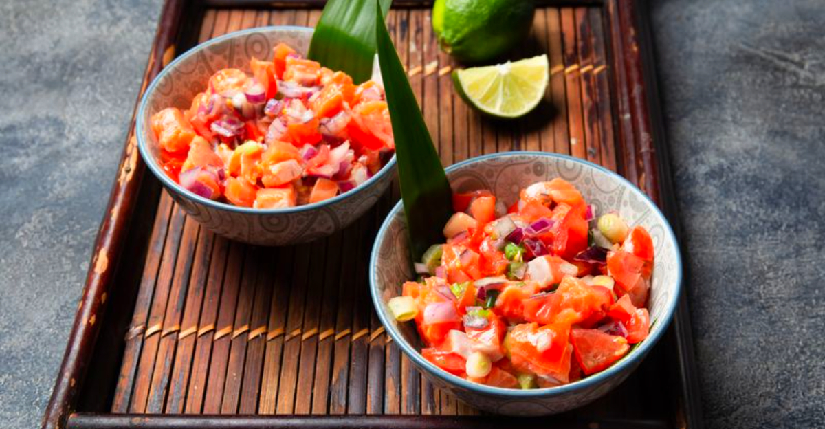 Salted salmon gets massaged (which is what lomi lomi means) with diced tomatoes and onions to create this refreshing salad. The salt-curing process gives the fish a firm texture and intense flavor that mellows when mixed with the vegetables.