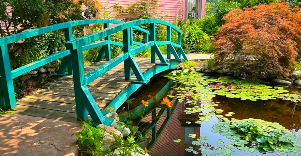 The bridge is the undisputed star of the garden, and it earns that title every single day. Painted in the same soft green that Monet used for his own bridge in Giverny, the arched structure spans a tiny pond and manages to look both delicate and sturdy at the same time.