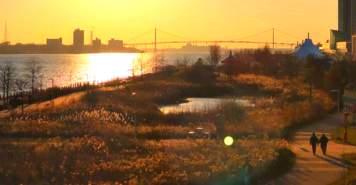 There’s a stretch of riverfront in Michigan where the Detroit skyline shimmers on the water and Canada feels just a glance away. It’s a side of the city most people don’t expect – far from highways and industry, and surprisingly calm.