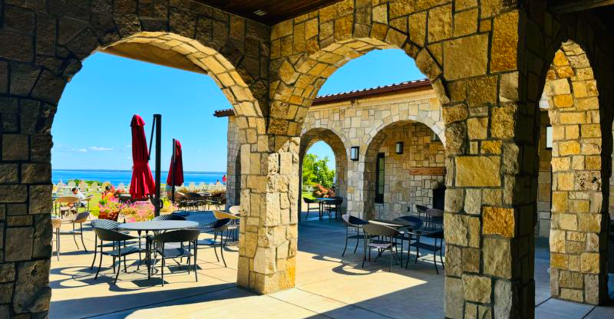 Perched on a hill along Old Mission Peninsula, Mari’s Tuscan inspired stone architecture frames an unforgettable panorama of East Grand Traverse Bay. You settle into Adirondack chairs, breathe the lake air, and watch light ripple across the vines.