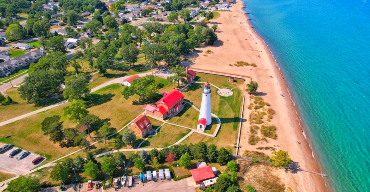 The moment the tower comes into view, the scene snaps into focus at 2802 Omar St, Port Huron, MI 48060. Michigan’s oldest lighthouse stands at the meeting of Lake Huron and the St. Clair River, and the setting feels both practical and poetic.