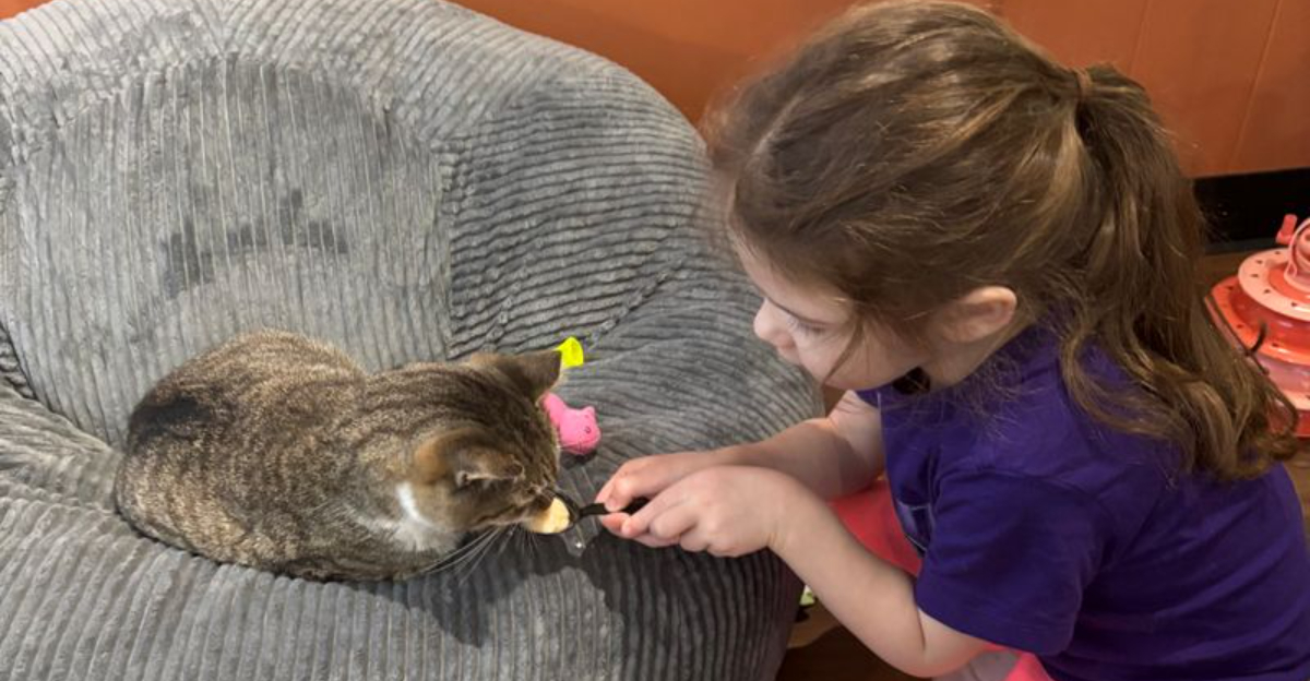 Volunteers help wrangle toys and share educational tidbits. Kids learn about care, adults learn about patience, and cats gain fans.