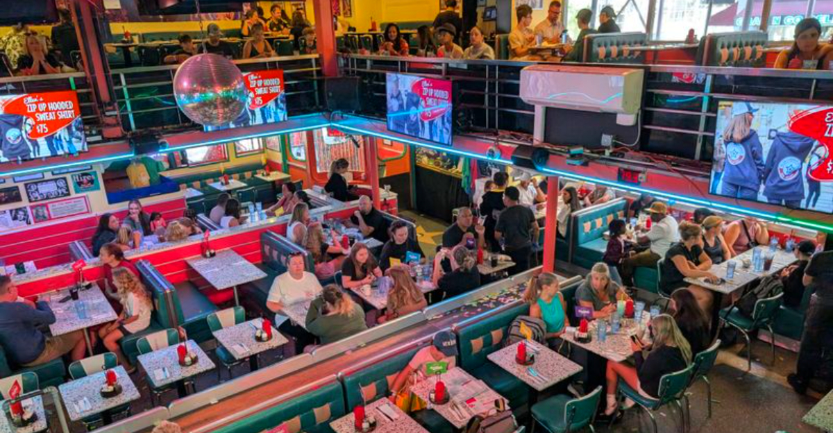 The diner leans into a vivid 1950s vibe, chrome gleaming under neon glow. Memorabilia lines the walls, and every booth feels like a time capsule set to a Broadway soundtrack.