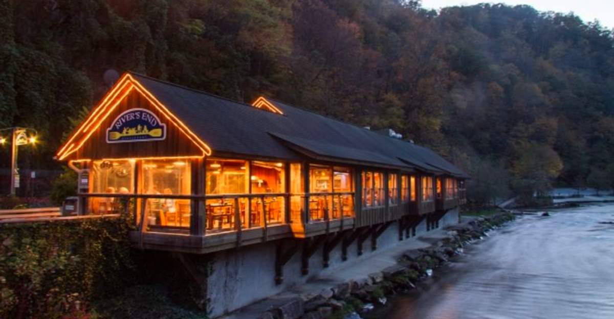 River’s End Restaurant leans into its riverside setting with easy confidence. Timber beams frame wide windows where the Nantahala River curls past, catching light that dances across polished tables.