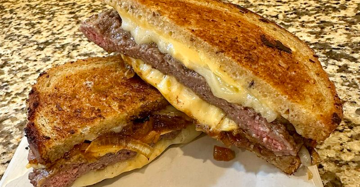 This sandwich lives at the delicious crossroads of burger and grilled cheese. A beef patty with grilled onions and melted cheese sits on buttered rye bread, cooked like a grilled cheese on the flat-top.