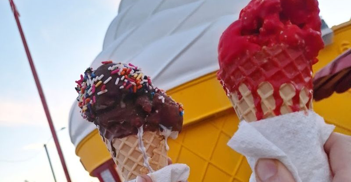 This is not a roadside gimmick or a painted mural on a strip mall wall. This is a fully functioning, beloved ice cream shop that has been scooping smiles for decades, and once you spot it from the road, turning around is basically mandatory.