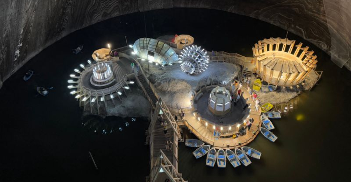 Platforms hang over a black underground lake where you can row a boat and watch ripples dance under pinprick lights. Nearby, a ferris wheel turns slowly, surreal in this subterranean cathedral, while wooden walkways thread between stalactite-like salt formations. Every turn reveals textures that look both lunar and handcrafted.