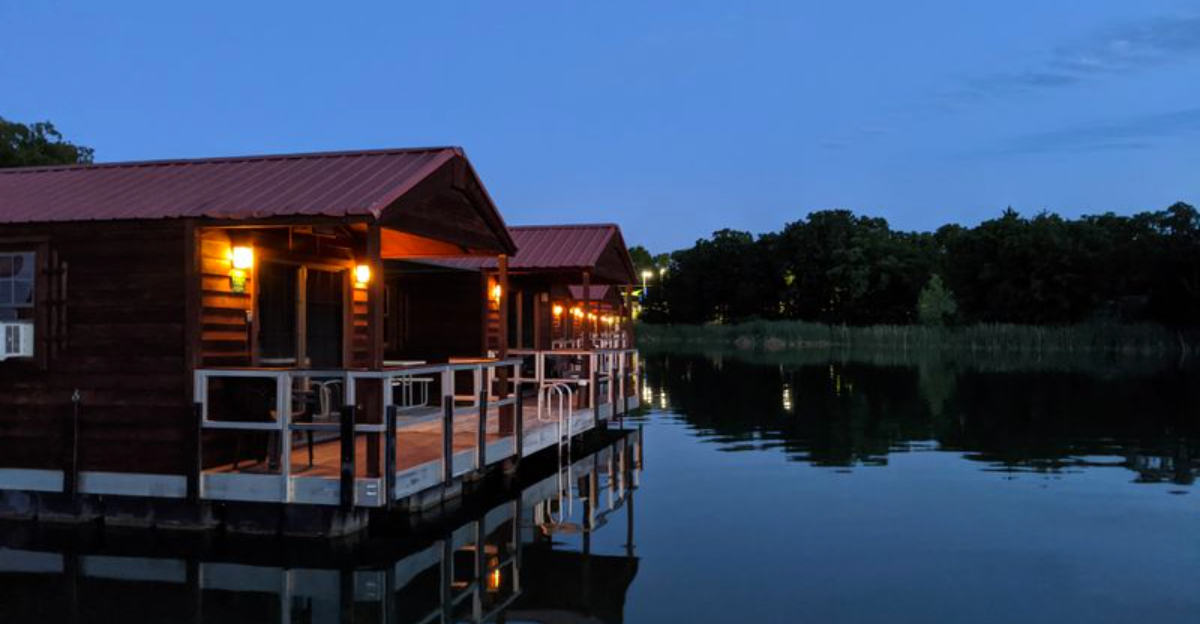 These aren’t just any cabins. They’re fully equipped homes that float on pontoons, giving you front-row seats to some of the most beautiful sunsets and fishing spots in the state.