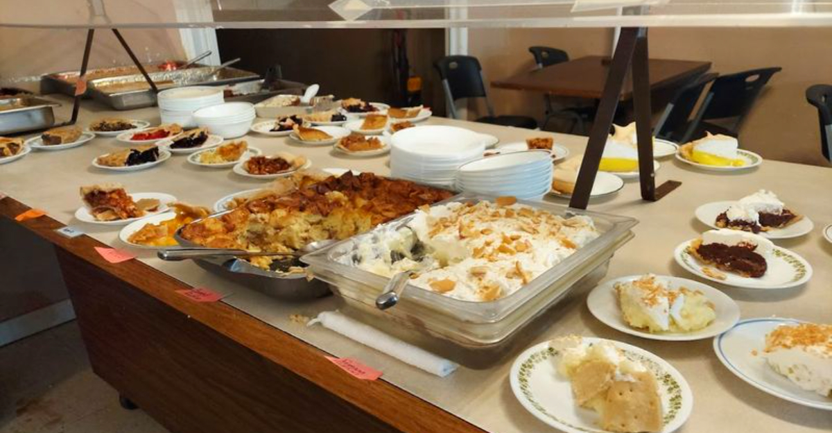 Peanut butter pie, lemon meringue, strawberry rhubarb, blackberry, pecan, and banana pudding are among the regulars that show up on the dessert table. The pies are cut into smaller slices intentionally, which is a smart move that lets you sample three or four varieties without committing to a full wedge of just one.