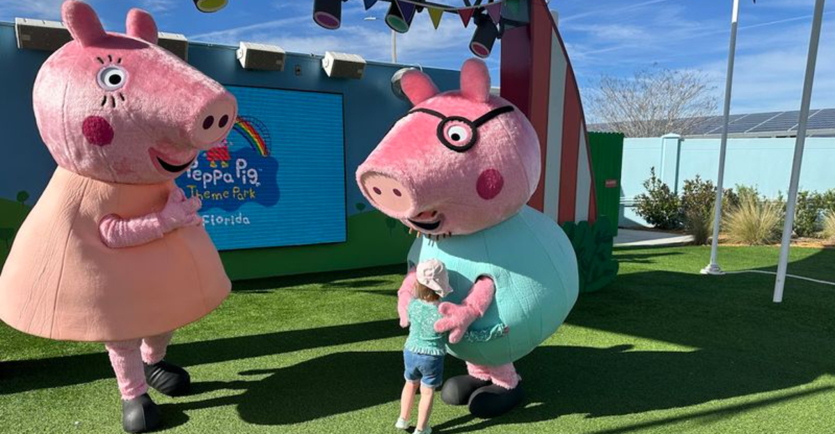Everything is pink, yellow, and sky blue, with oversized cartoon cutouts of Peppa, George, Mummy Pig, and Daddy Pig greeting you before you even reach the ticket booth. The park sits within the broader Legoland Florida resort area, making it easy to find and well-connected to the surrounding attractions of Polk County.