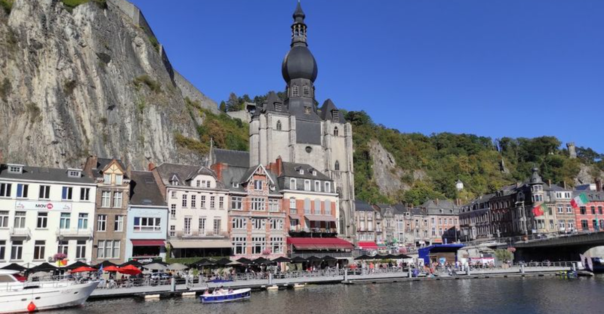 Dinant has the kind of backdrop that makes you check whether someone has enhanced the photo. Wedged between towering limestone cliffs and the Meuse River, the town looks cinematic before you even step off the train.