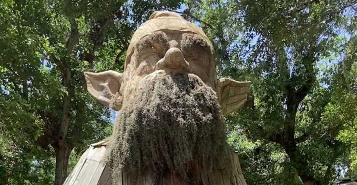 The gnome is genuinely massive up close, with a weathered, textured appearance that makes it look like it grew straight out of the forest floor. Kids absolutely lose their minds over it, and adults are not far behind.