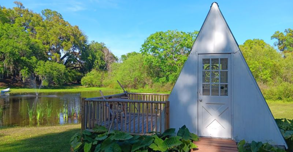 The A-frame accommodations are positioned closest to the lake and the common area, making them a top pick for guests who want that water view as soon as they step outside. The landscape around the lake is lush with the kind of Florida greenery that photographs beautifully but feels even better in person.