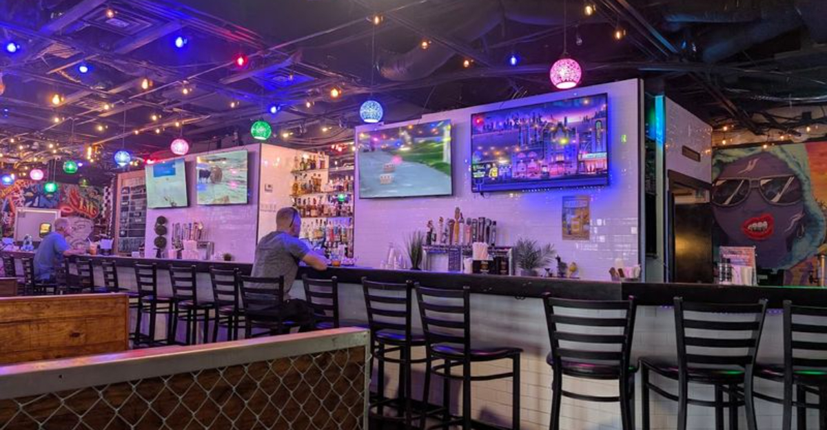 Vintage-style glass windows, bold artwork covering the walls, and a lineup of TVs overhead give the space a personality that feels more like a neighborhood institution than a quick-stop eatery.