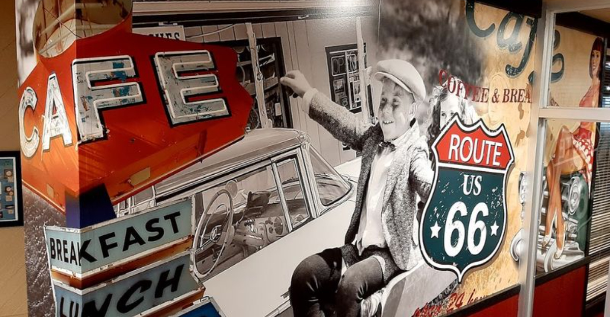 The walls carry Route 66 memorabilia and classic Americana touches that feel earned rather than purchased wholesale from a catalog. Everything looks like it has a story behind it, and most of it probably does.