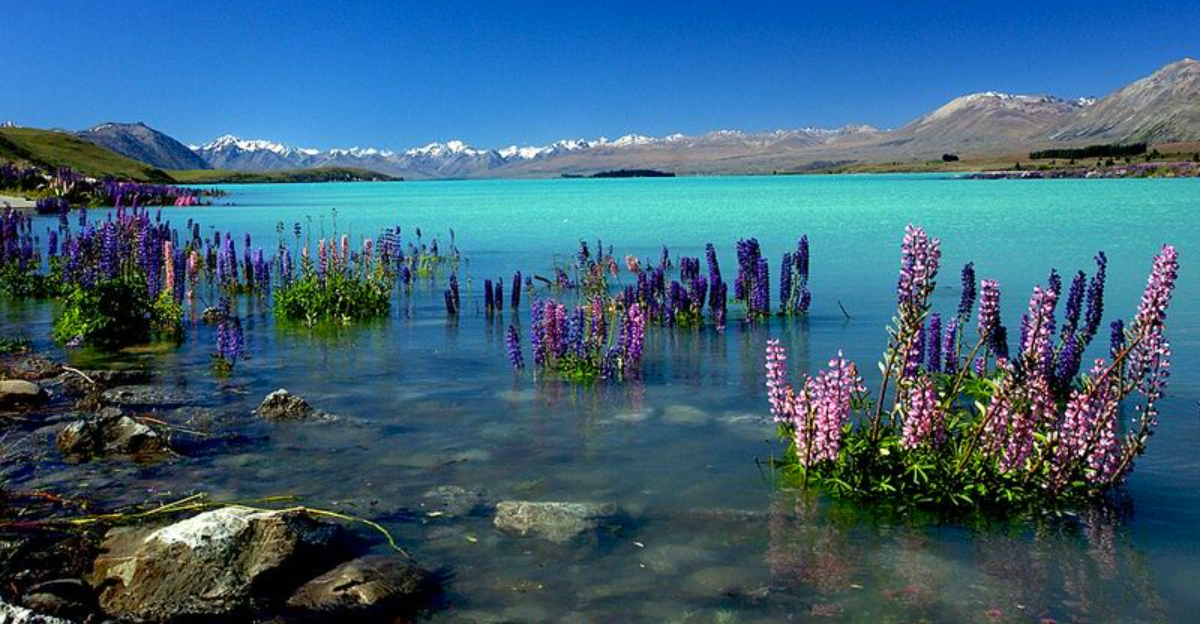 Lake Pukaki is a runway of electric blue aimed straight at Aoraki Mount Cook. Wind-sculpted tussock plains meet glacial water so vivid it reads as neon. On calm days, the Southern Alps duplicate themselves in mirror reflection, making the horizon dissolve. Pullouts along the highway offer constant photo ops, each with a slightly different composition of water, clouds, and ice. The drive becomes an unfolding gallery. In season, lupines and golden grasses frame the view like a painter’s border. It is the kind of scene you doubt until you stand there and realize the color is spectacularly real.